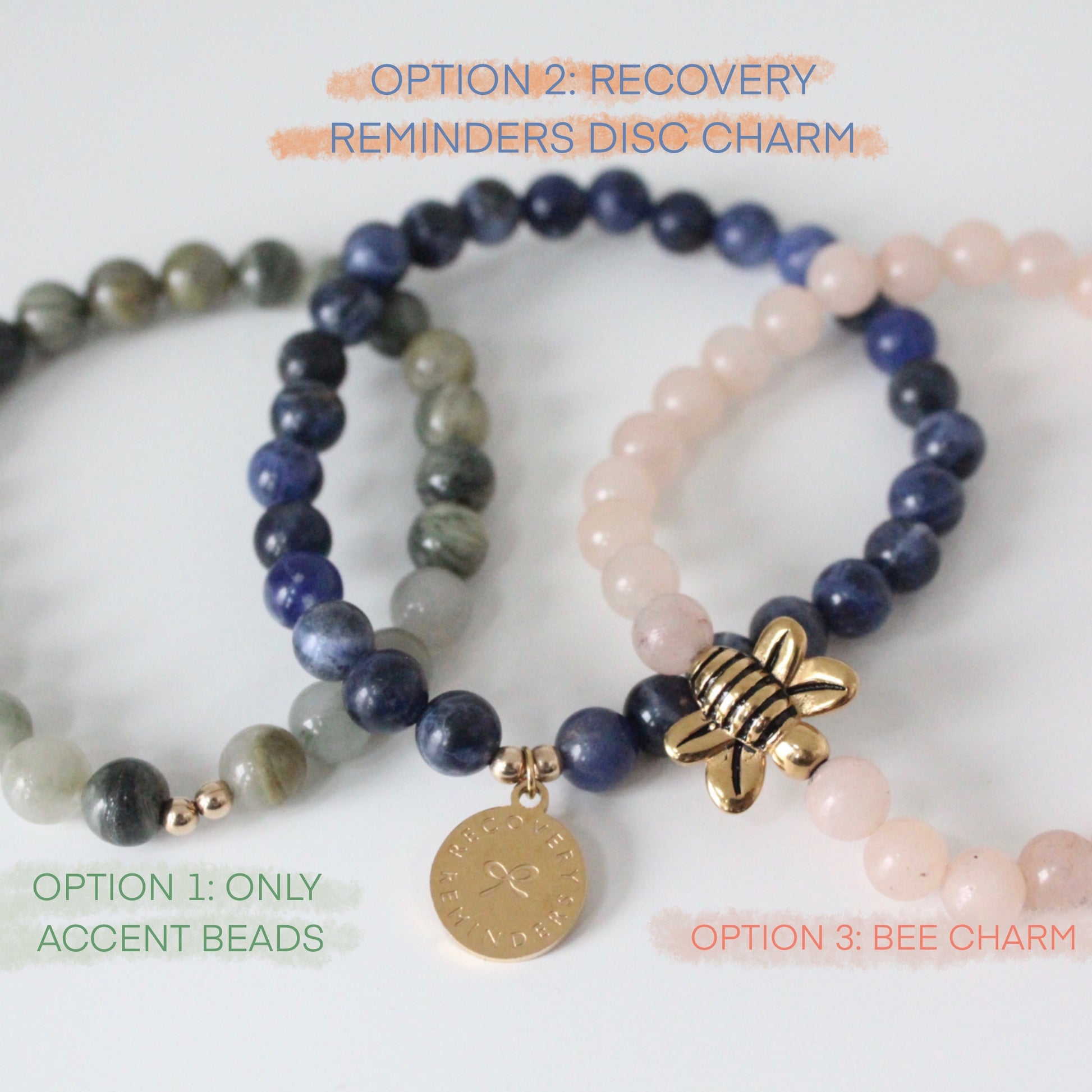This bracelet may include beads made from the following materials; gemstones, glass, wood, clay, plastic, acrylic, brass. Bead sizes may differ slightly.
